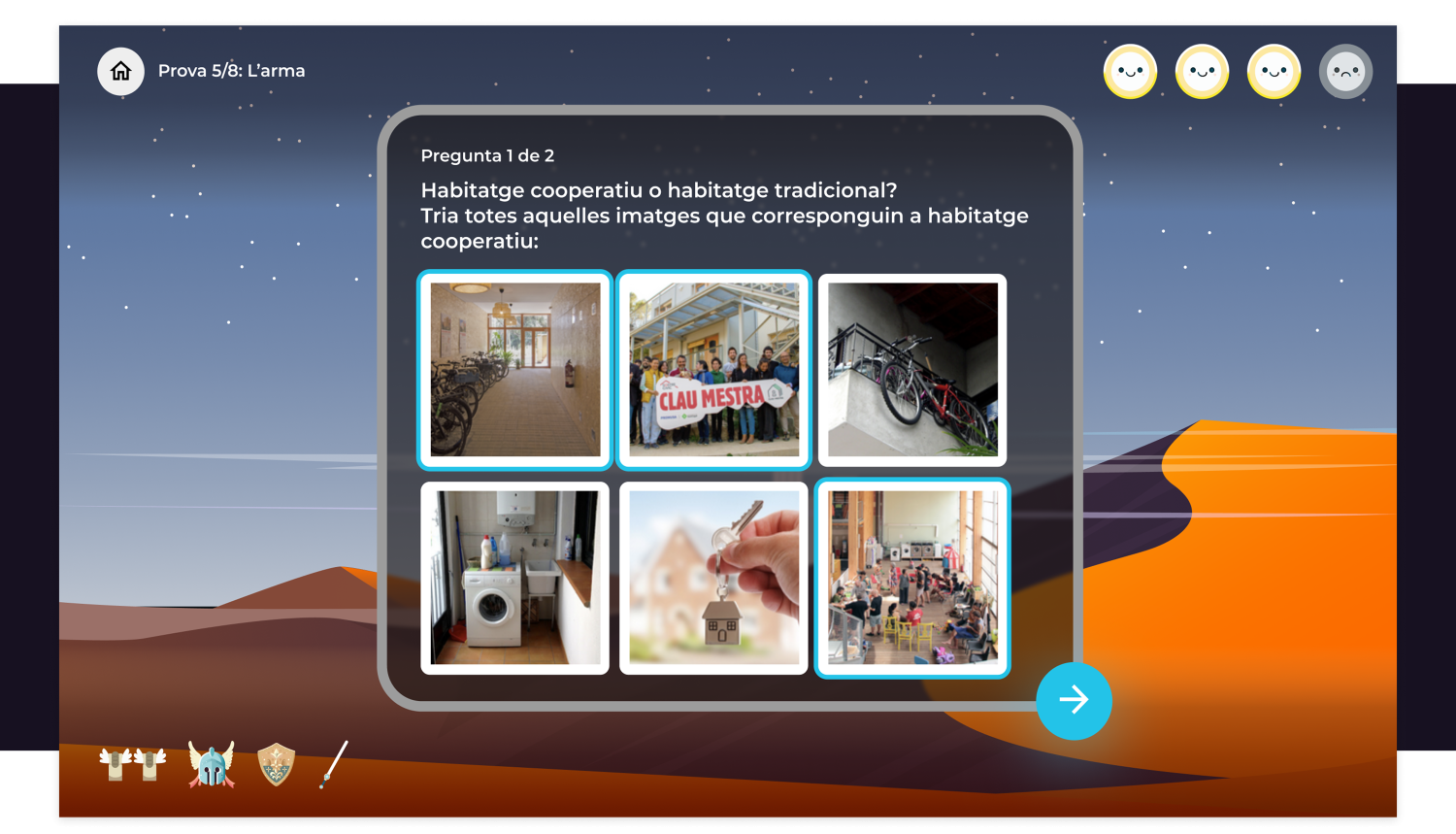 La Xarxa de Economía Solidaria de Cataluña nos encargó el diseño y desarrollo de un juego con el objetivo de poner a prueba los conocimientos sobre la economía social de los jugadores. Este juego se jugaría en ferias de economía social, lo que añadía un grado de complejidad, ya que los participantes estarían de pie, frente a una pantalla de tamaño variable (a veces una televisión, a veces una tableta) y en entornos con mucha gente y ruido. Además, el presupuesto era ajustado y, como es habitual, no disponíamos de mucho tiempo porque la fecha de la primera feria estaba muy cerca.
