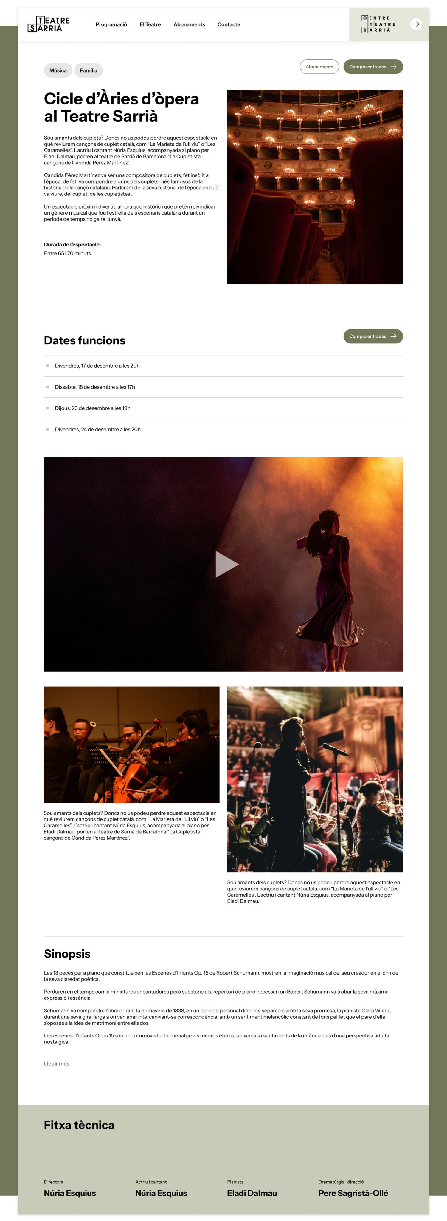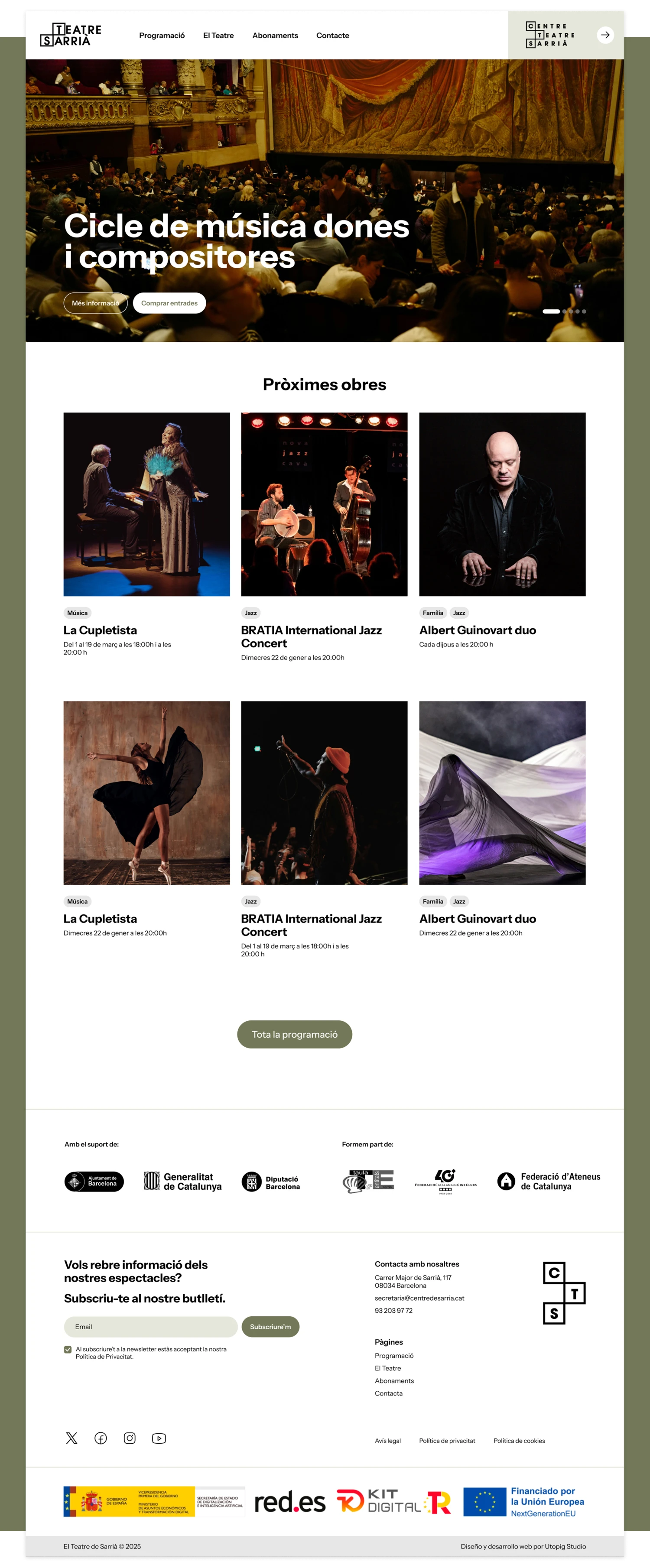 El Teatre de Sarrià y el Centre de Sarrià son dos espacios de referencia cultural y social del barrio de Sarriá, en Barcelona. Nos encargaron rediseñar y modernizar sus webs para reflejar mejor su actividad y facilitar la gestión de la programación y las reservas.