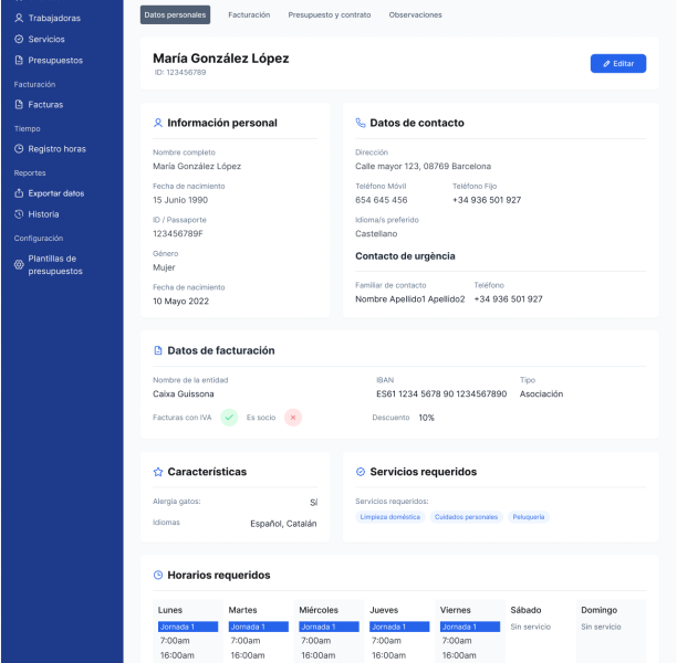 La herramienta permite gestionar procesos habituales como la facturación, los presupuestos, la gestión de clientes y trabajadoras, las asignaciones entre servicios y la documentación asociada a la actividad de la cooperativa.